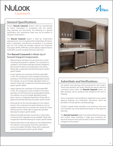 Our NuLook Casework is custom designed and pre-fabricated to your requirements. Amico will meet your design while decreasing installation time and costs. Our Foot/Side Walls are the perfect match to our industry-leading headwall systems.